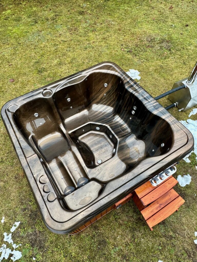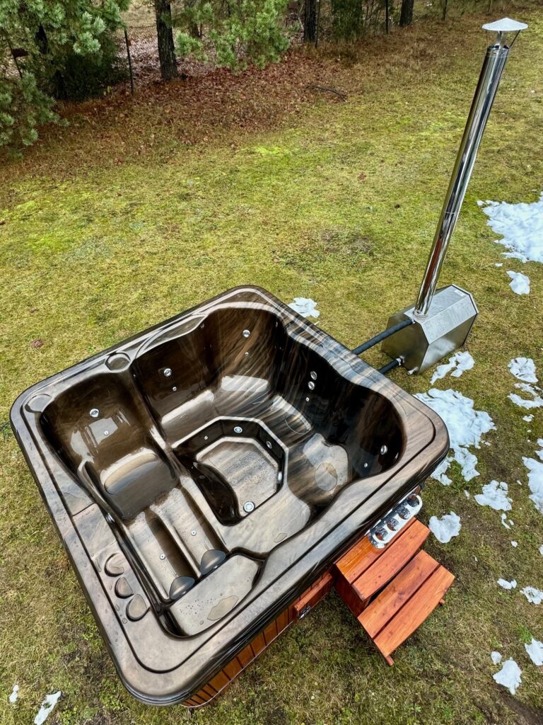 Square hot tub – a spacious and modern model that combines functionality with modern design. It can be made with either an acrylic or plastic liner: the acrylic insert, formed using vacuum technology, is easy to maintain, highly durable, and resistant to scratches, while its ergonomic shape ensures optimal comfort. The plastic insert, made from durable polypropylene, offers a wider range of sizes and excellent resistance to various environmental factors. A wooden exterior finish adds natural aesthetic look, while the inner liner ensures effortless maintenance. Square hot tubs can be heated with integrated or external wood-burning stoves, or electric heaters, making them a reliable, modern, and highly convenient choice.