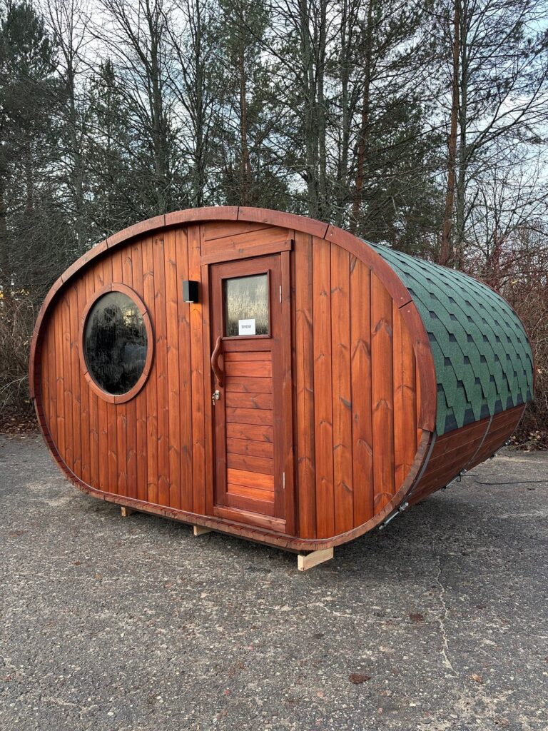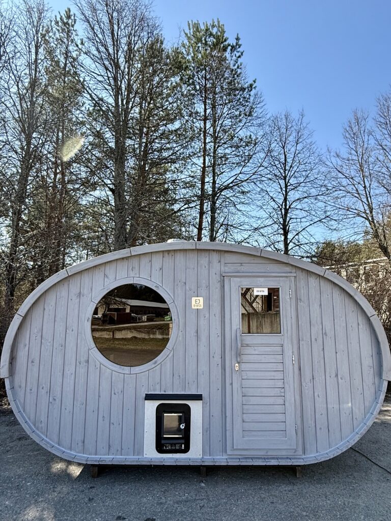 This is a completely new model where the width of the sauna is extended. Appearance wise it is completely different and will instantly stand out from the standard-shaped saunas. The oval sauna can have a large outdoor terrace as an additional option, and this new structure provides maximum usable space with less area to heat.