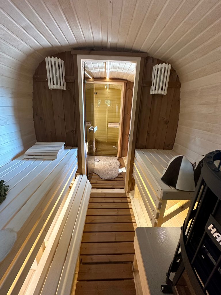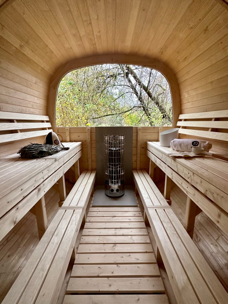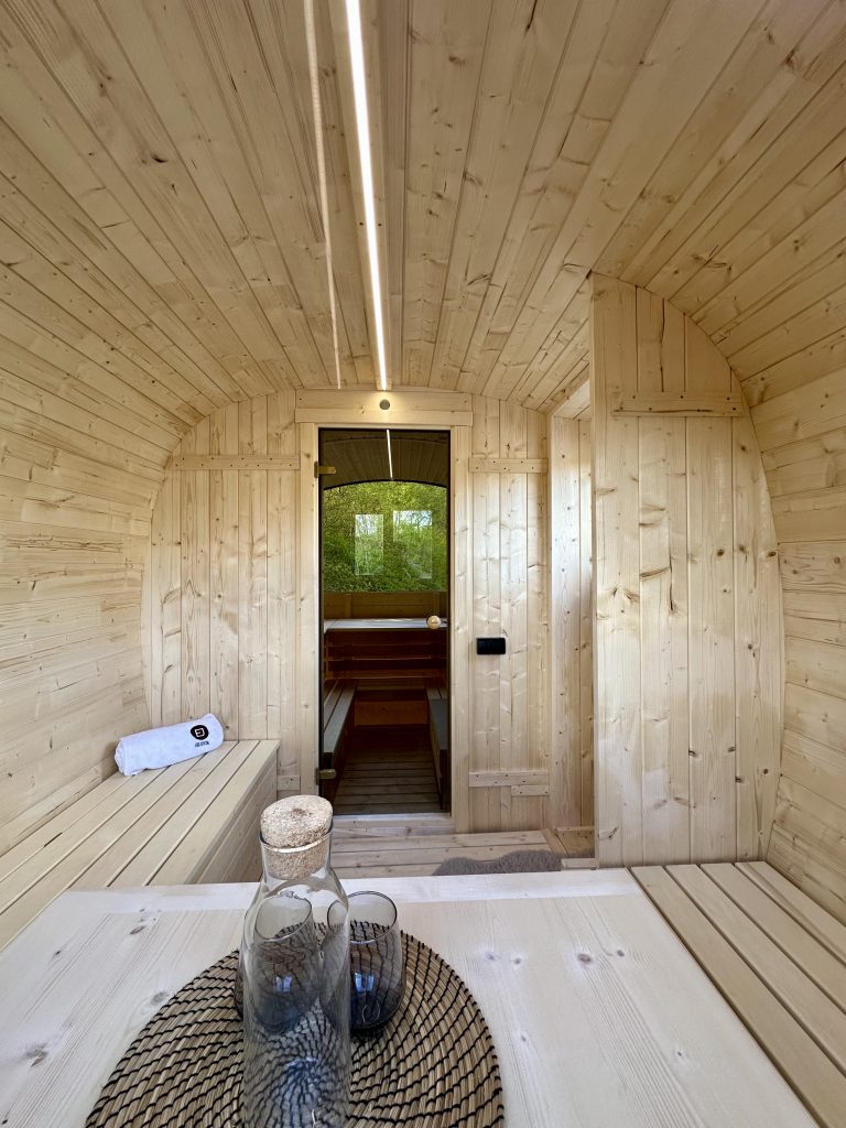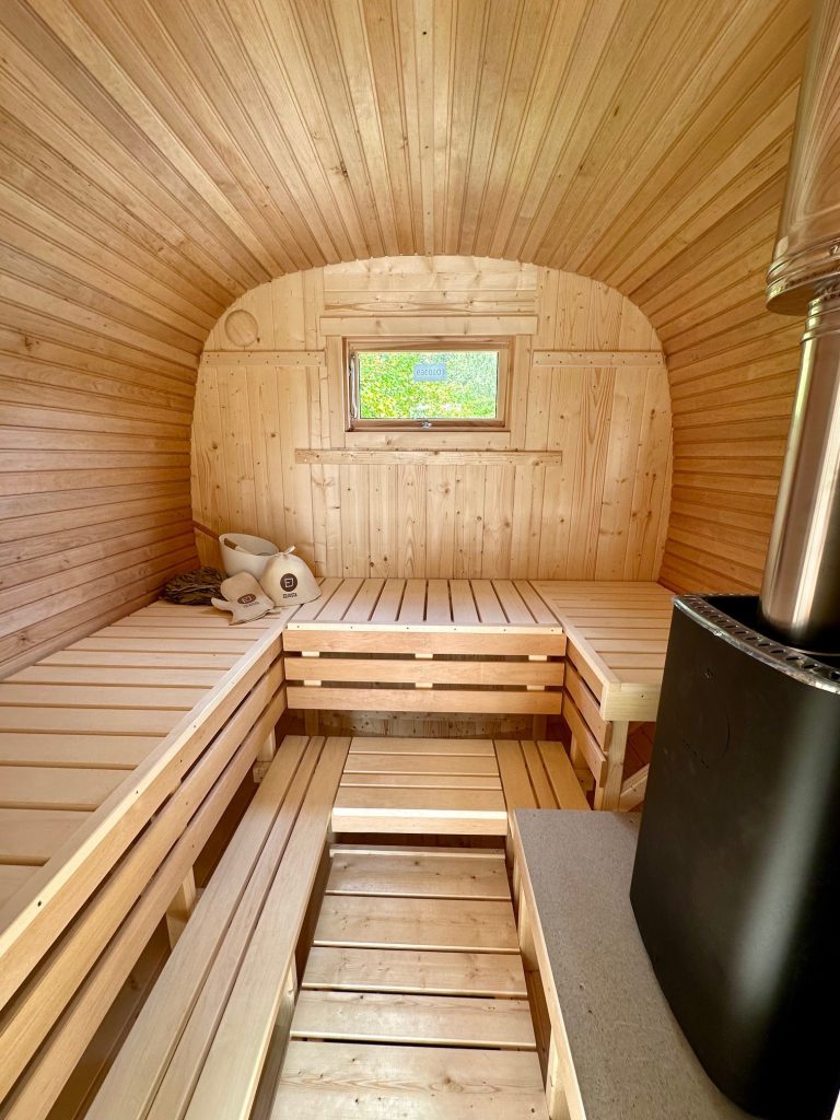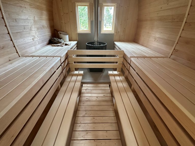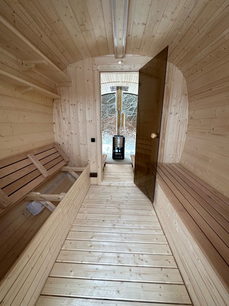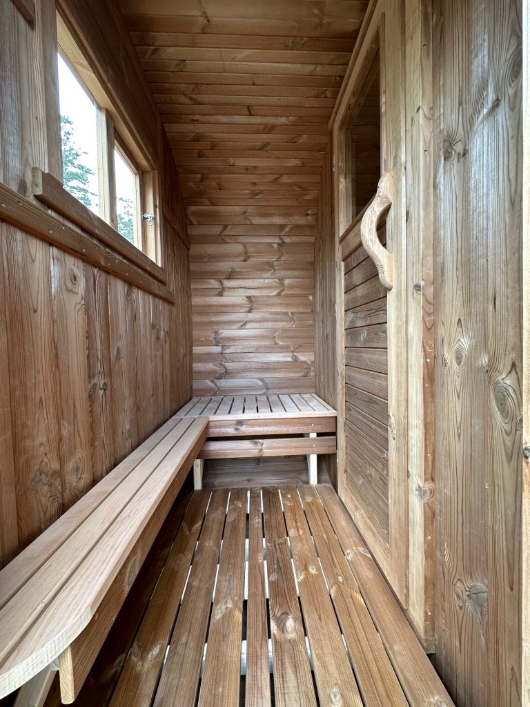 - Soft hardwood paneling for the sauna interior.