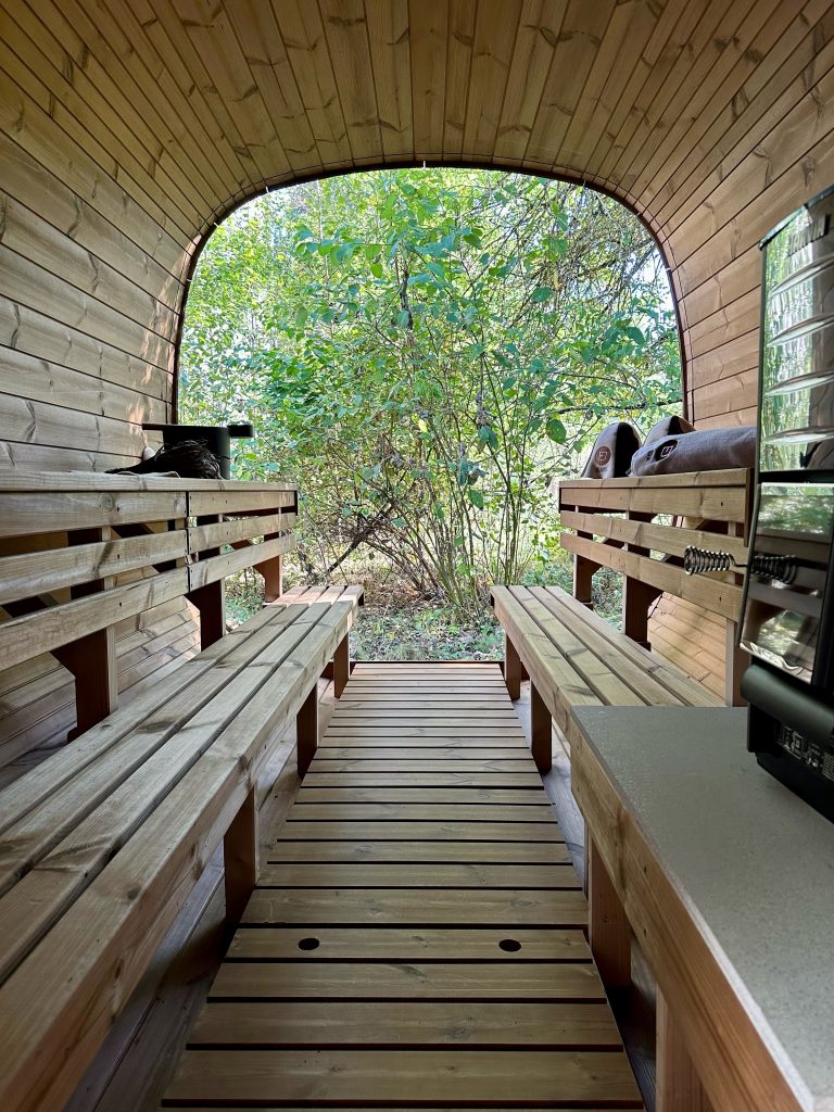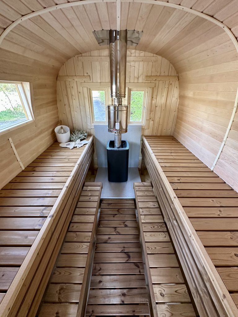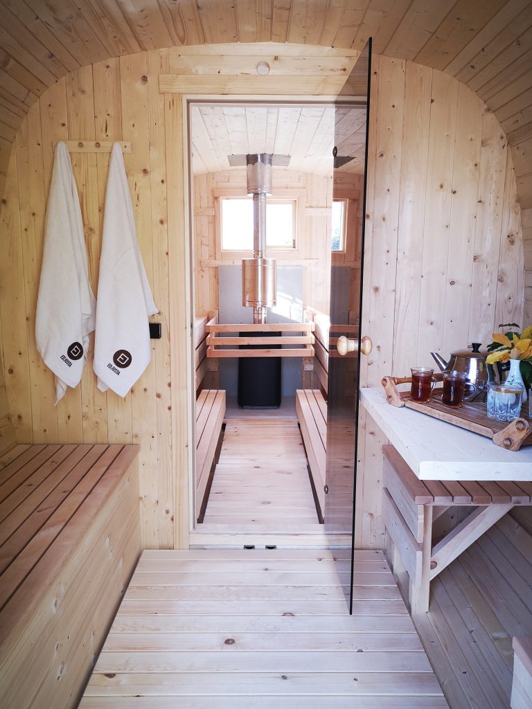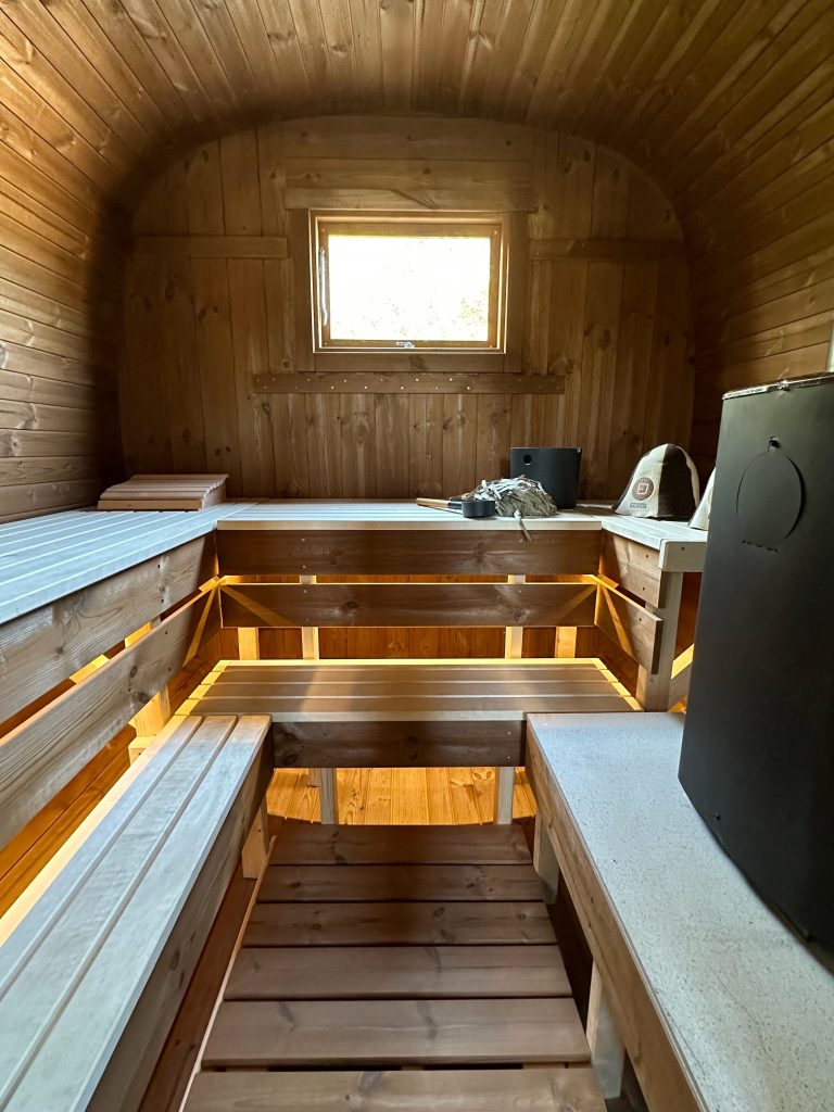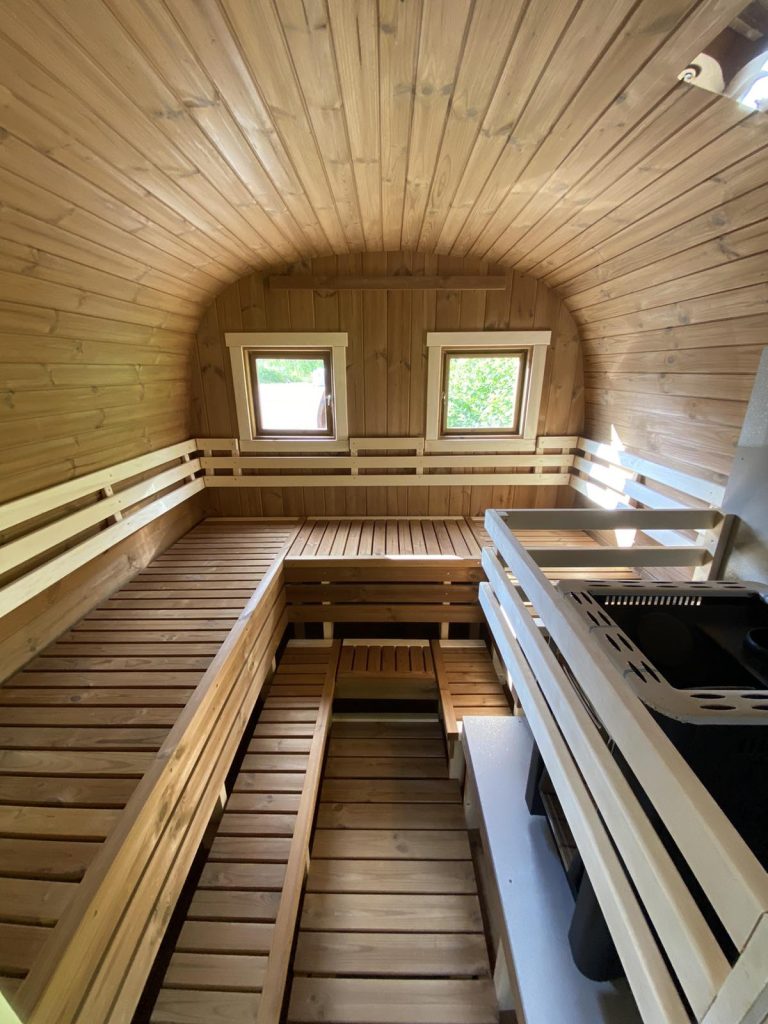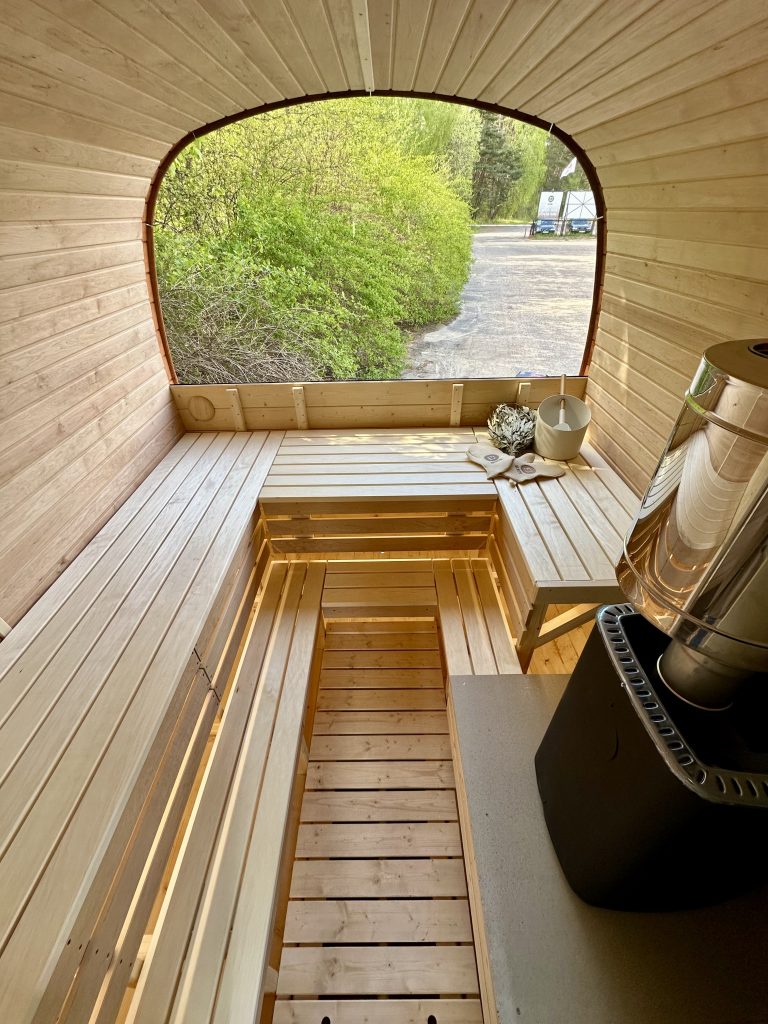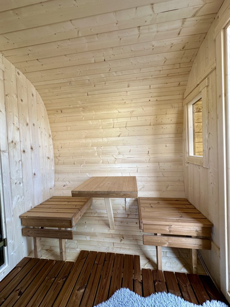 - Soft hardwood paneling for the sauna interior.
