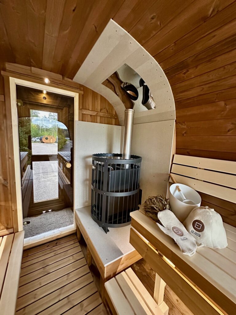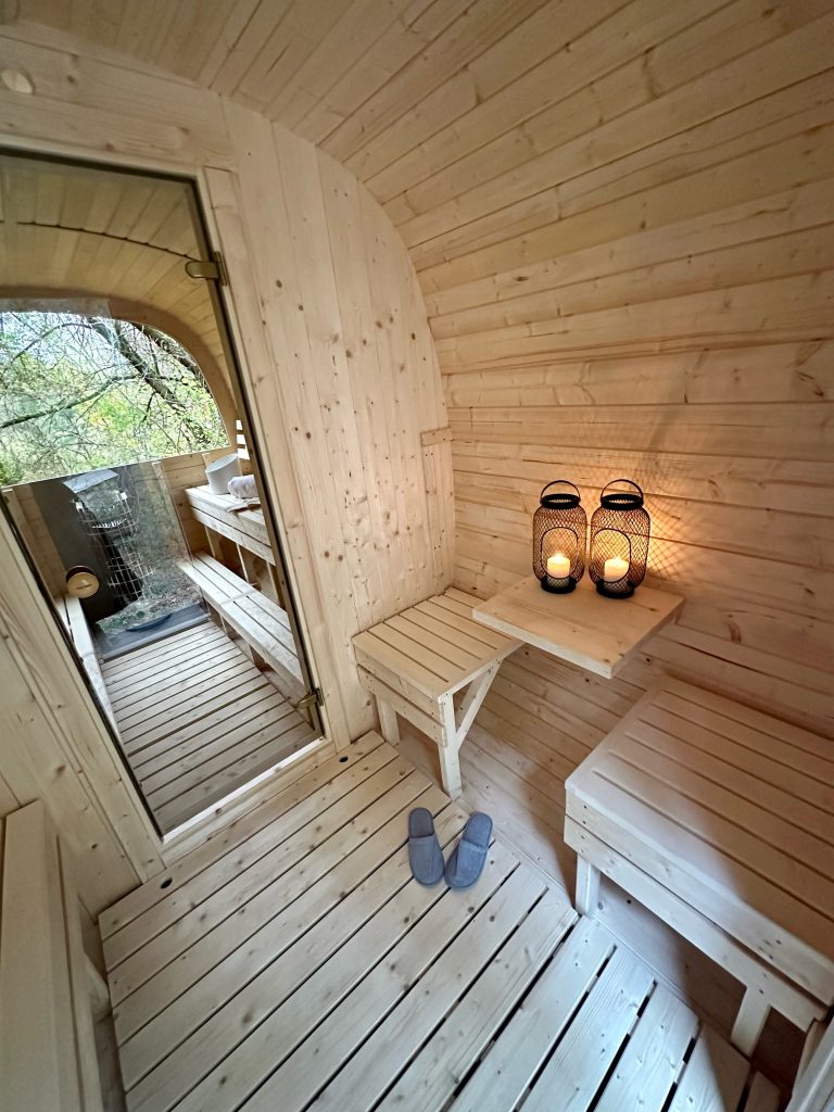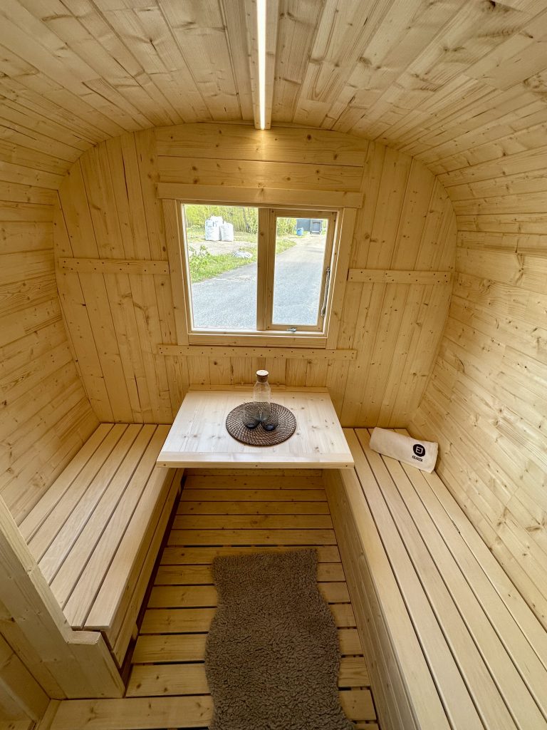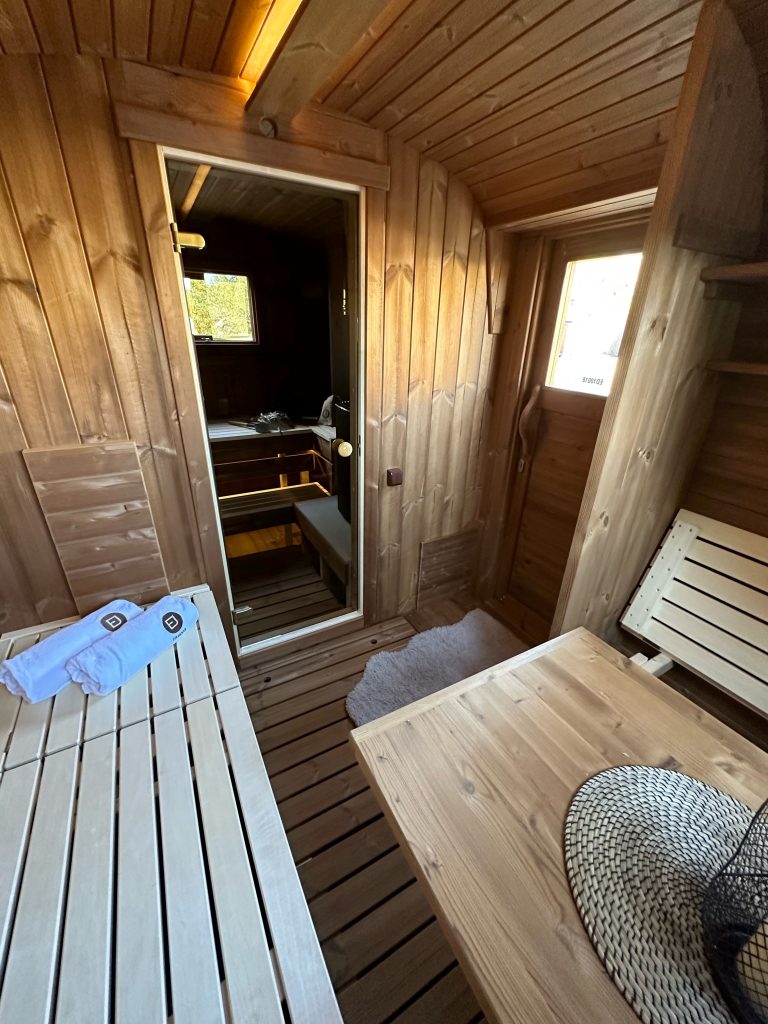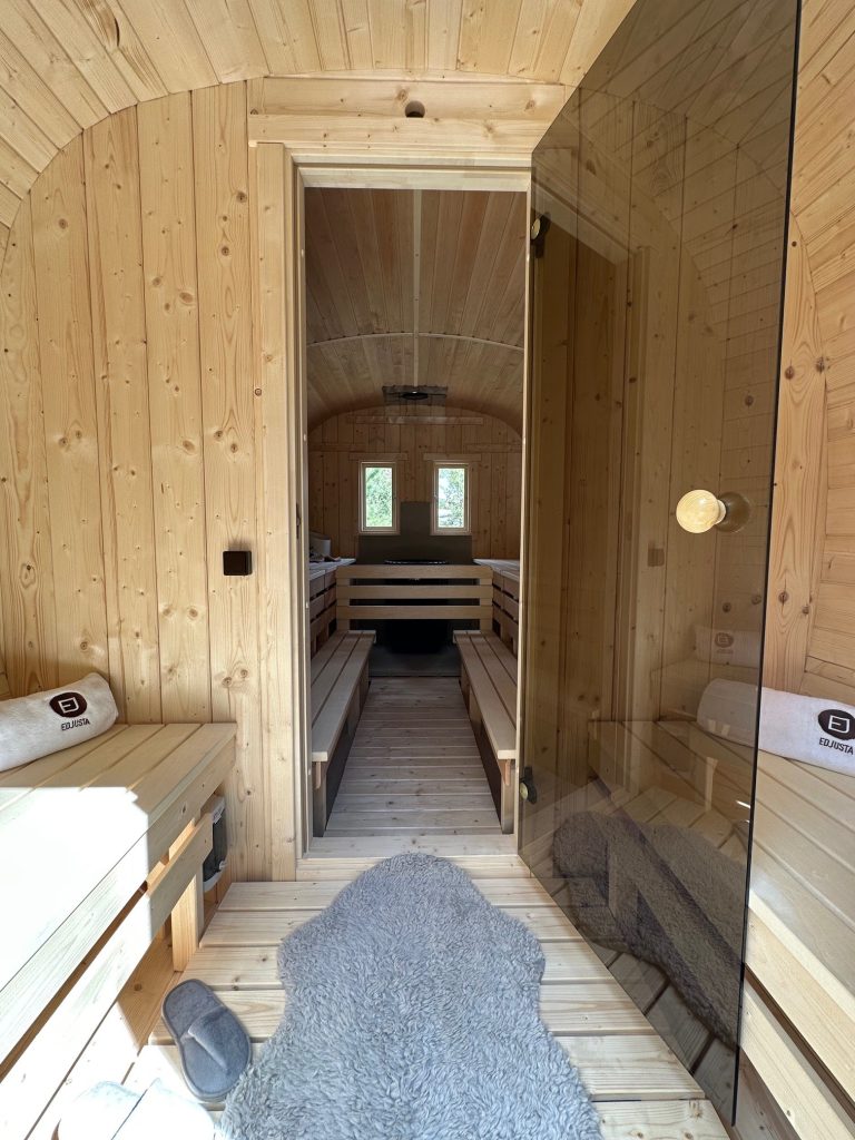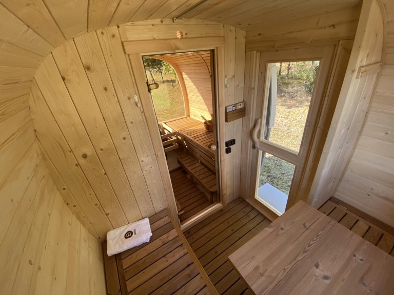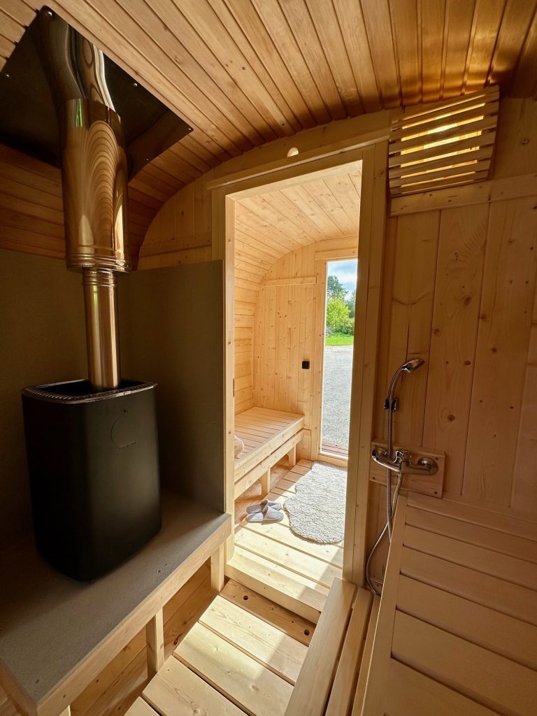 - Soft hardwood paneling for the sauna interior.