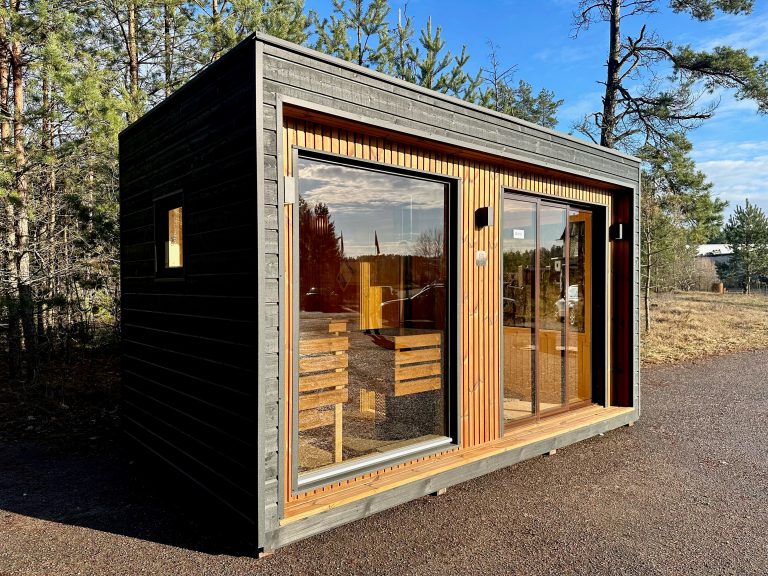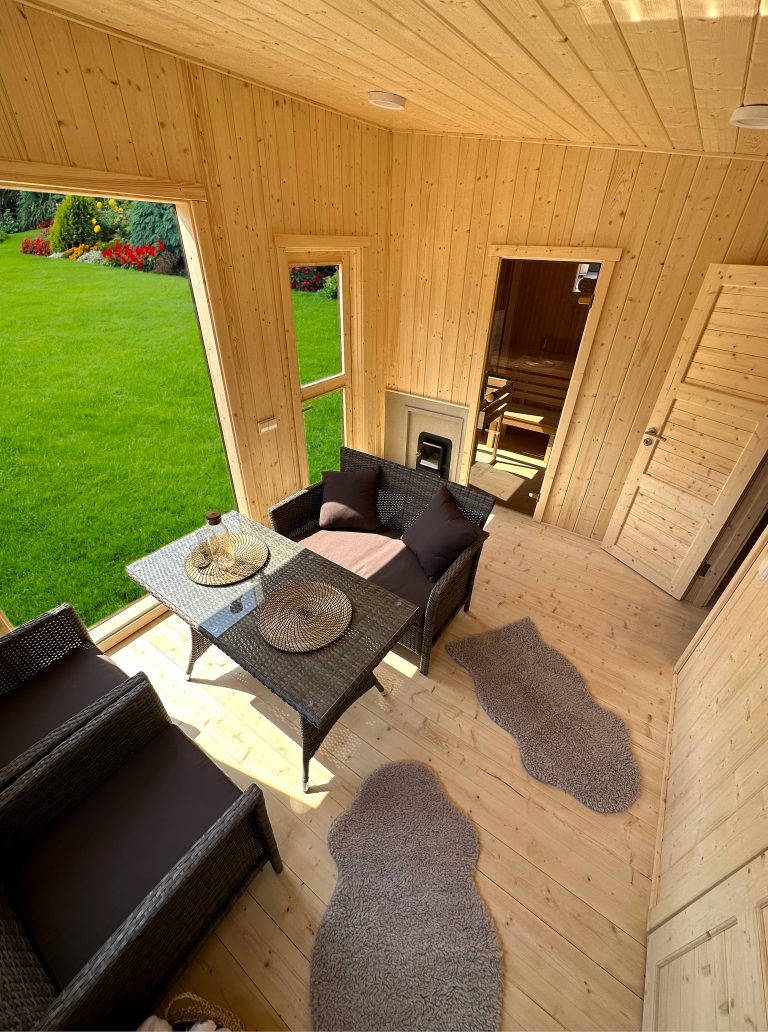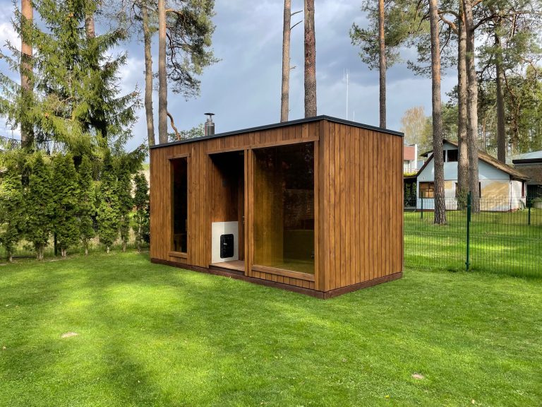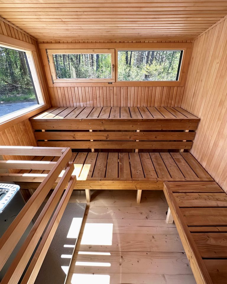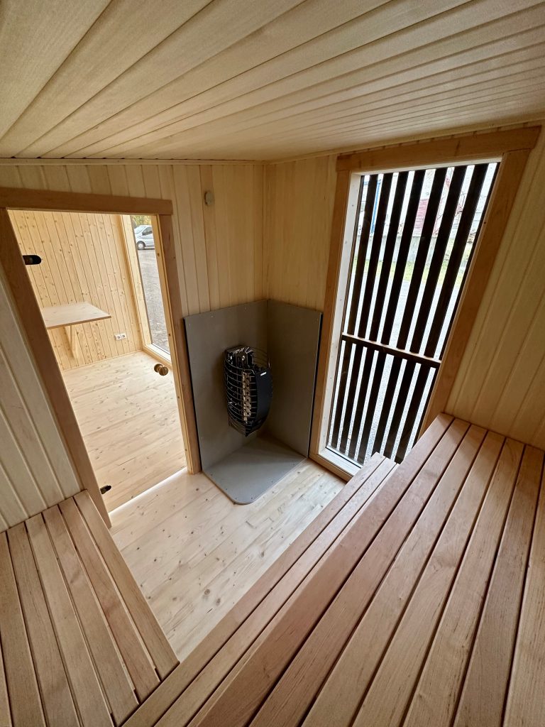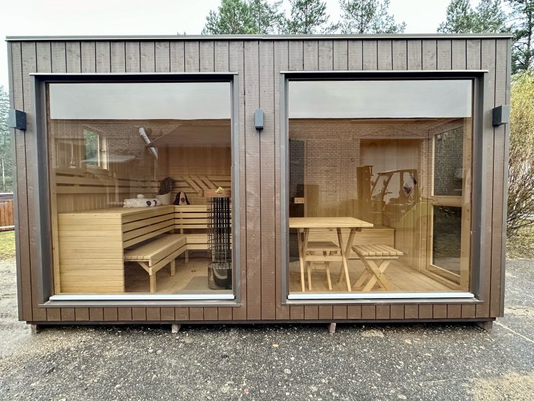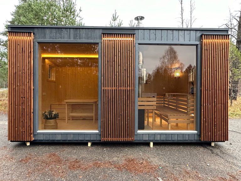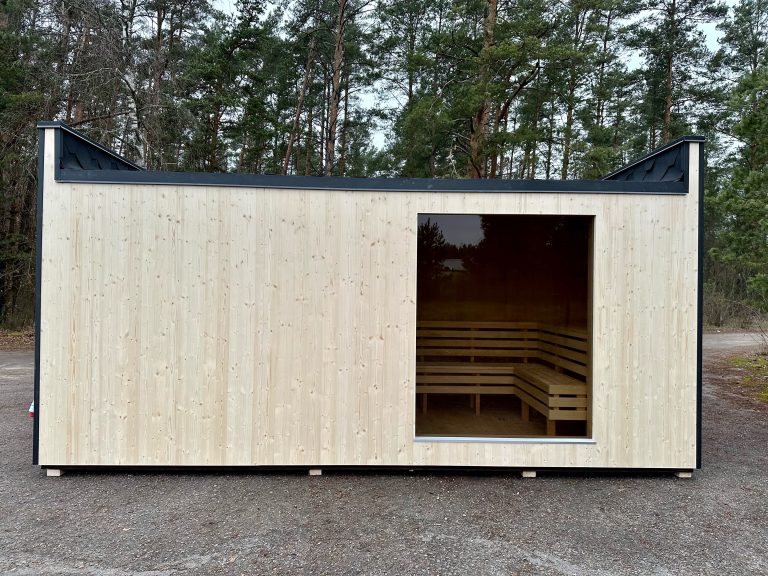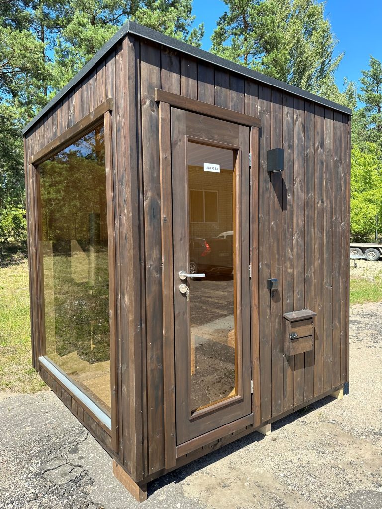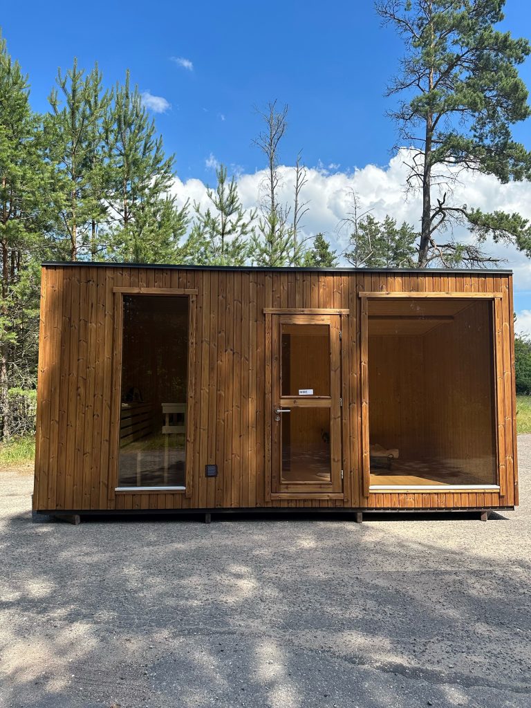 A new, modern design sauna that will look fabulous in your backyard. Large tinted tempered glass windows give this sauna a stylish and contemporary feel. The spacious and cozy lounge area is well-suited for gatherings, relaxation or leisure. You can convert your lounge room into a guest bedroom or swap the entire sauna for a mobile office. Sauna ,,Moderno‘‘ can be customized to match all your needs.