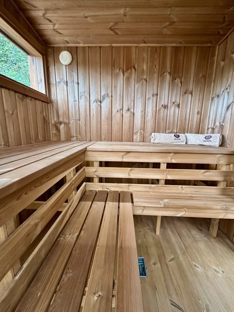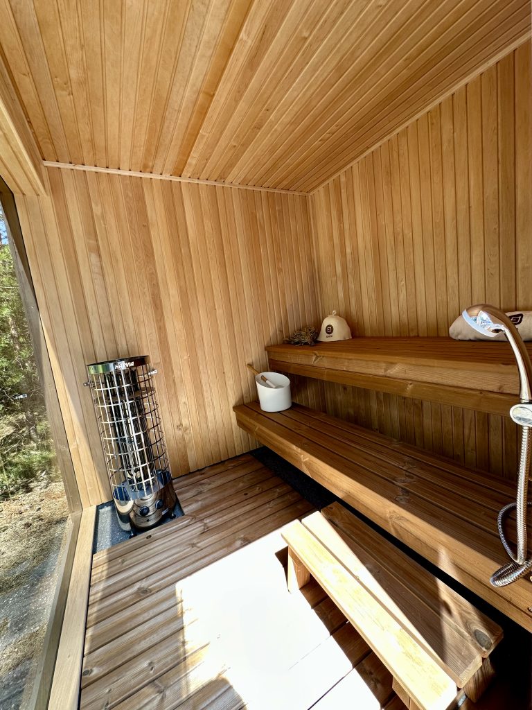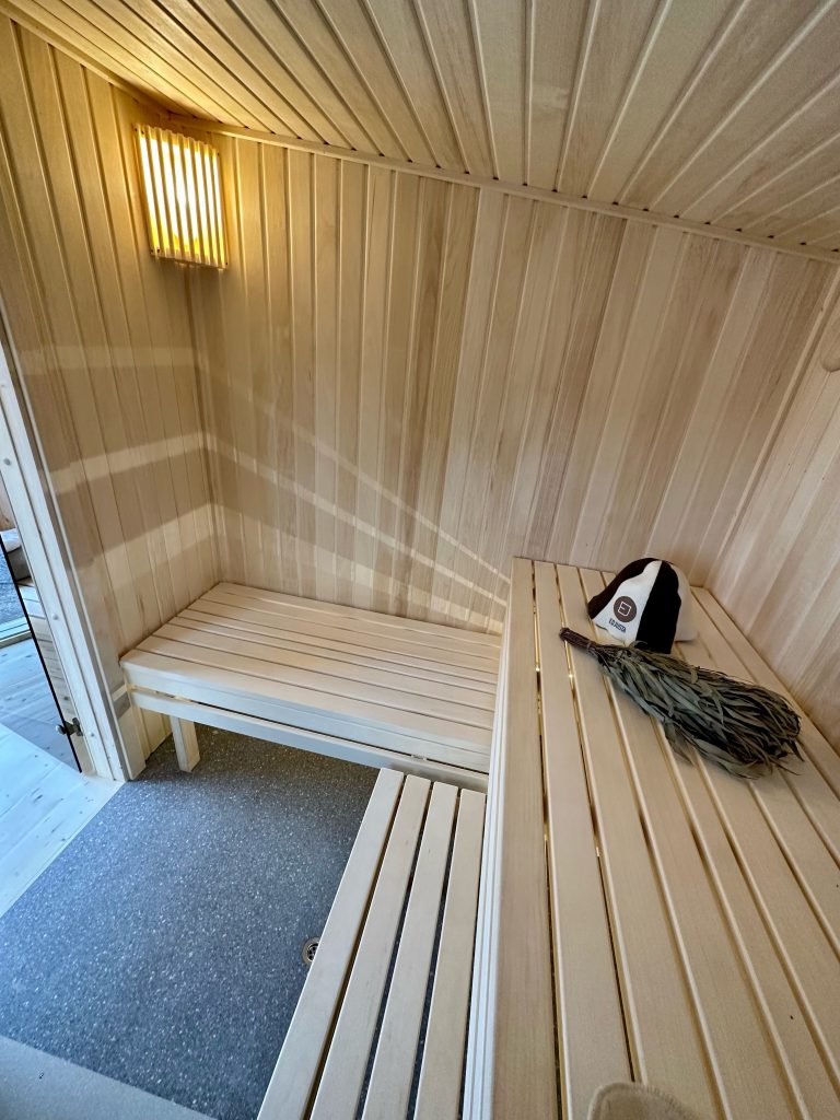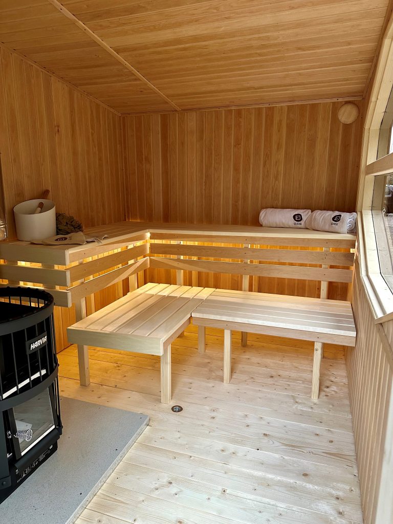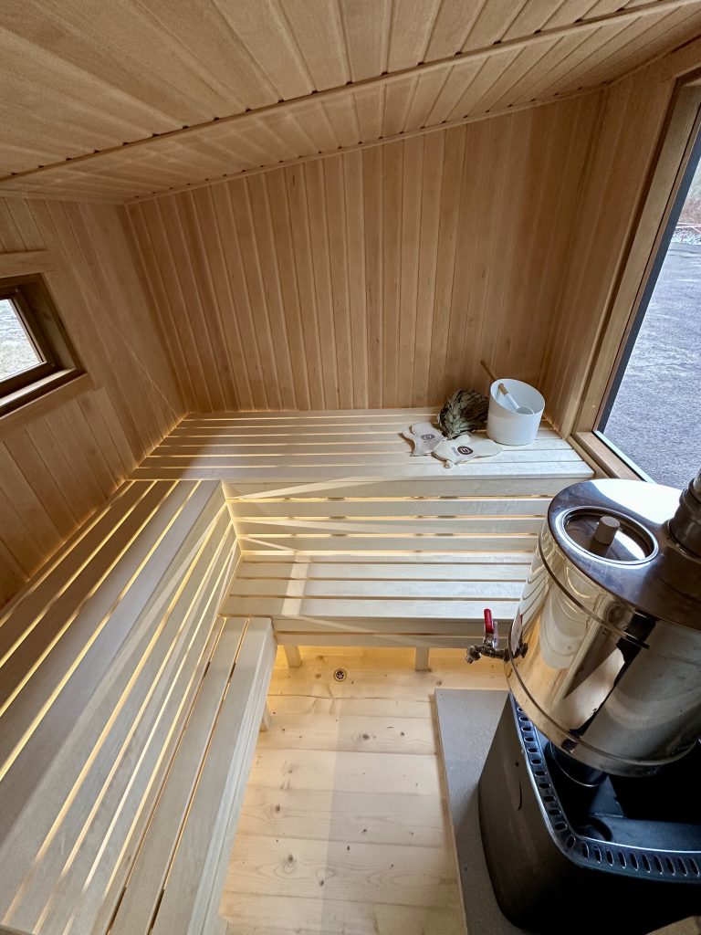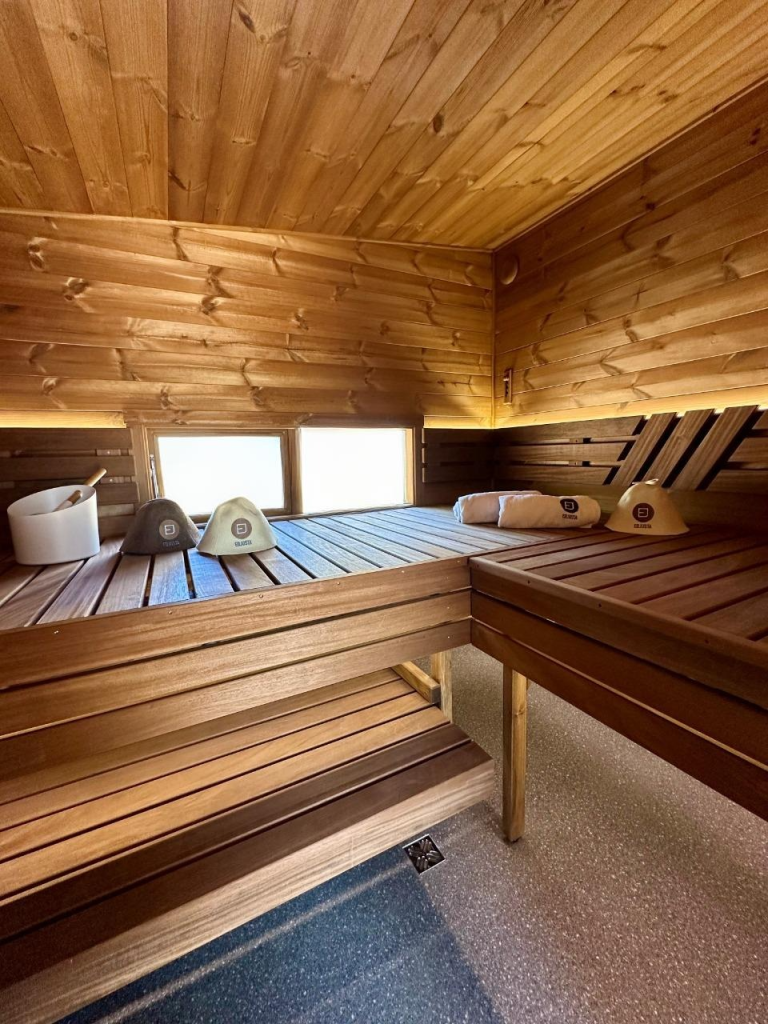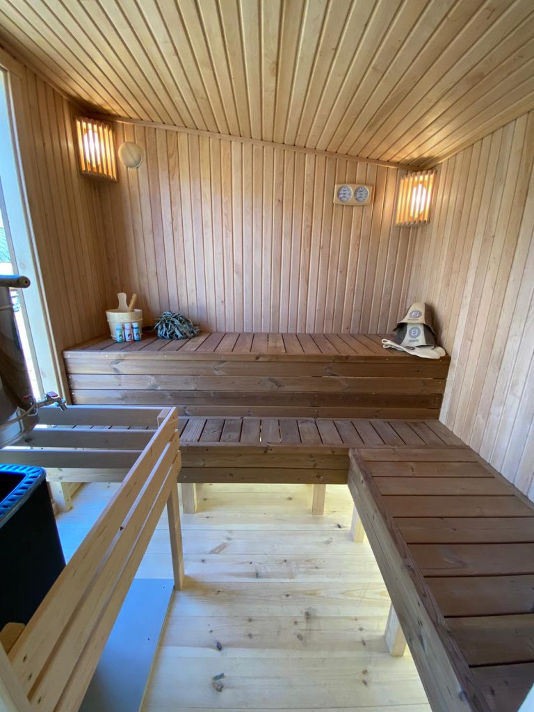 - Soft hardwood paneling for the sauna interior.