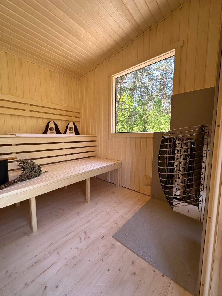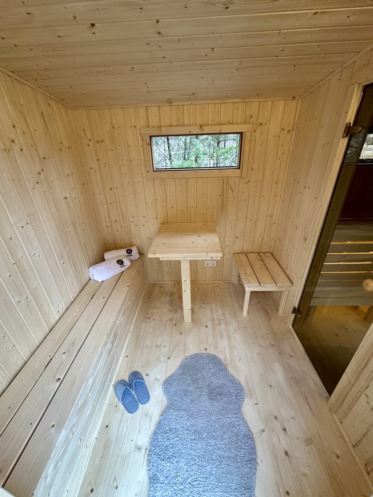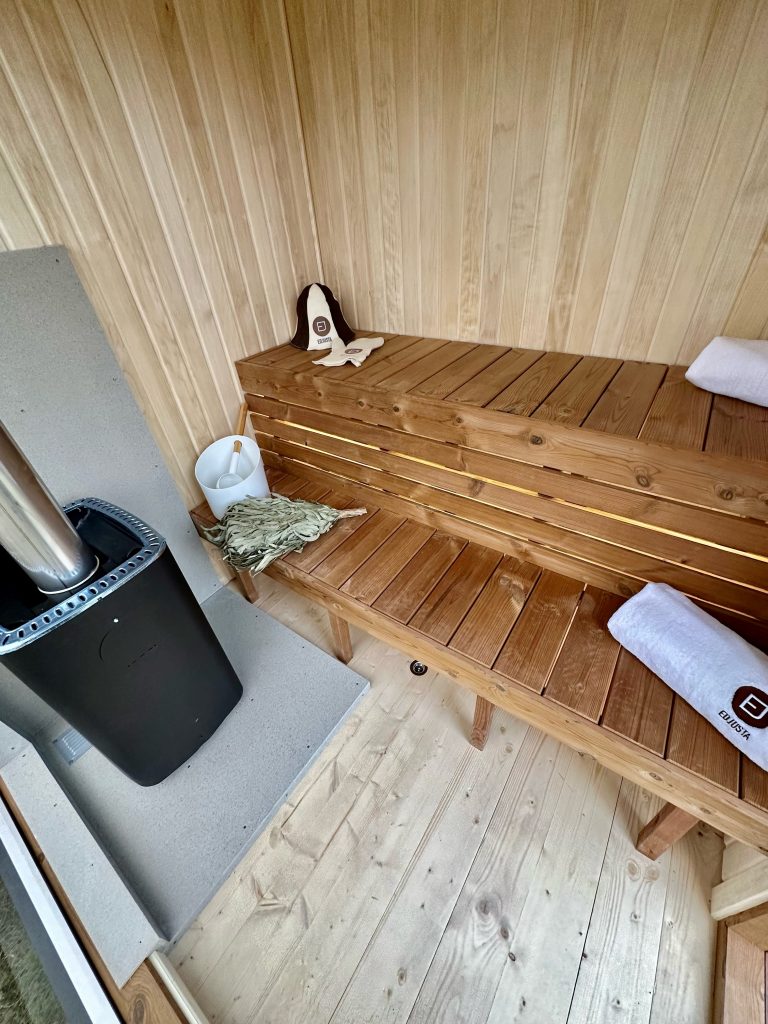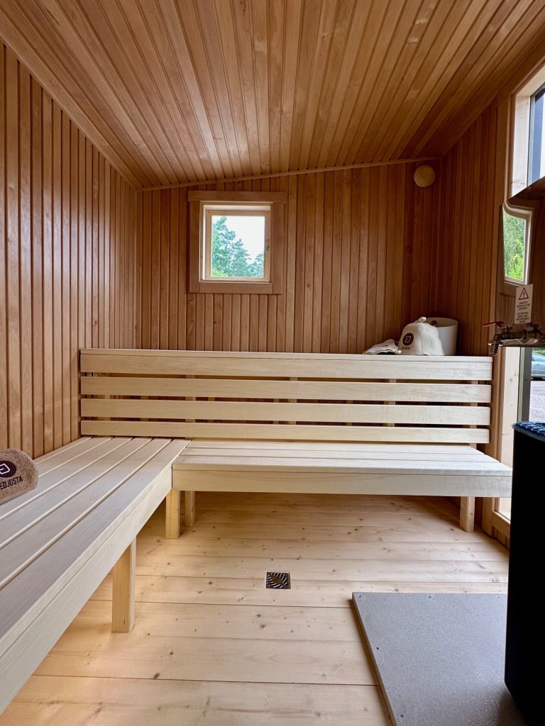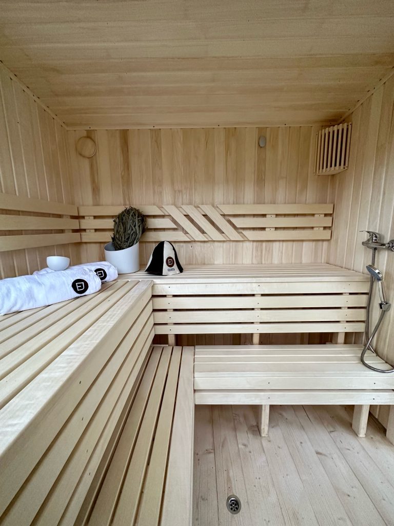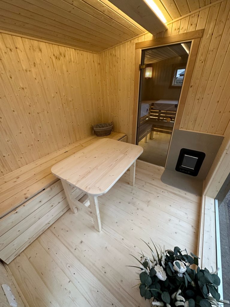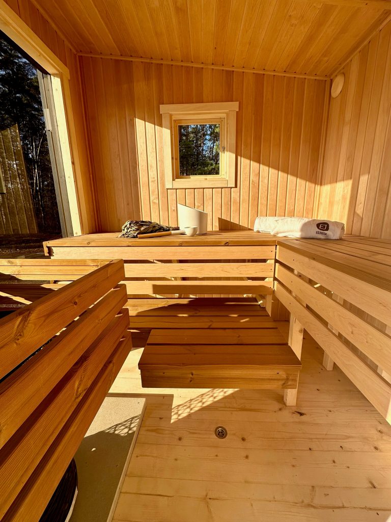 - Soft hardwood paneling for the sauna interior.