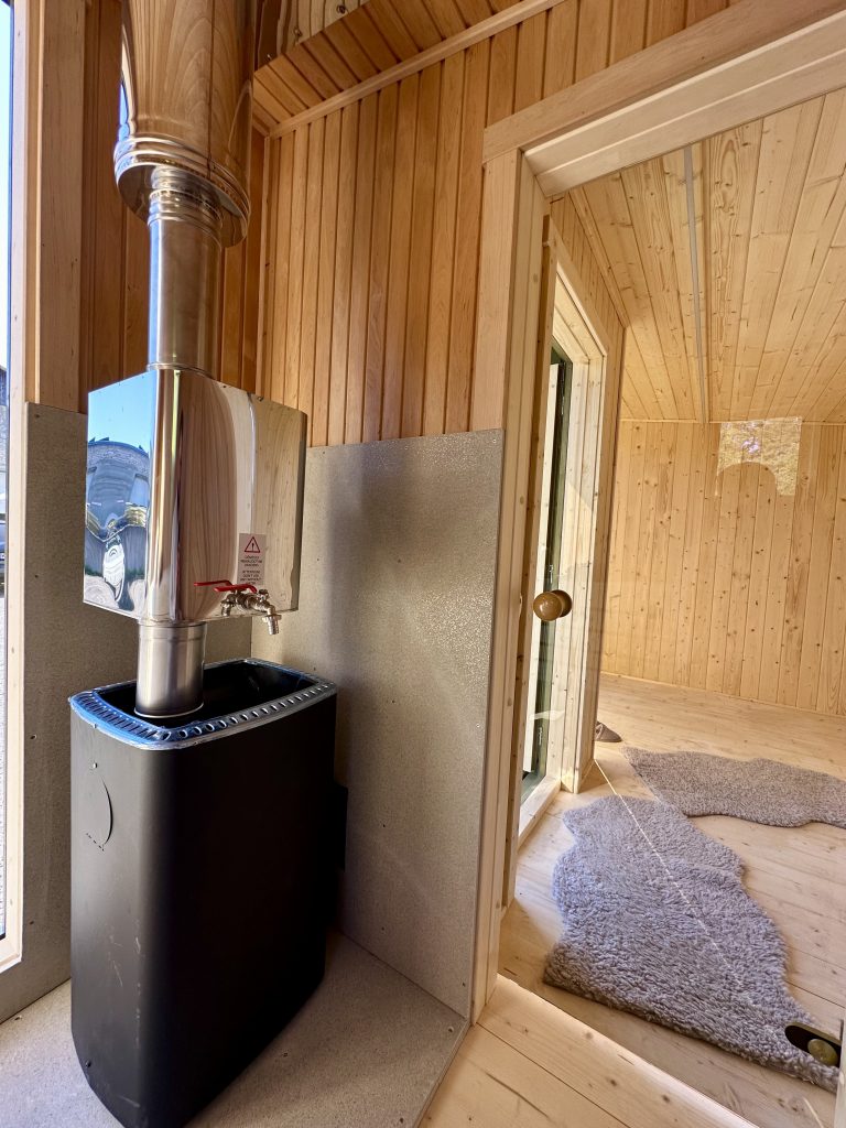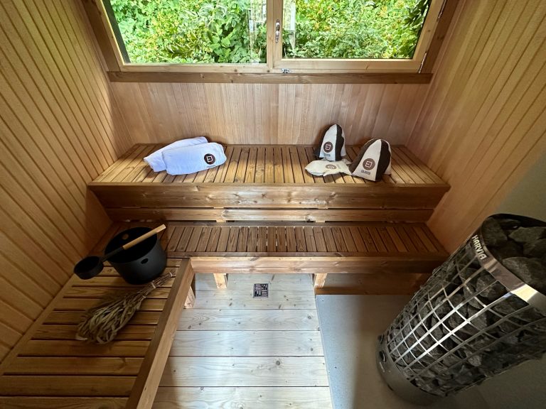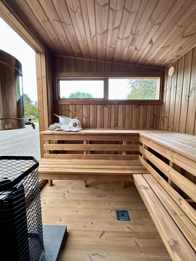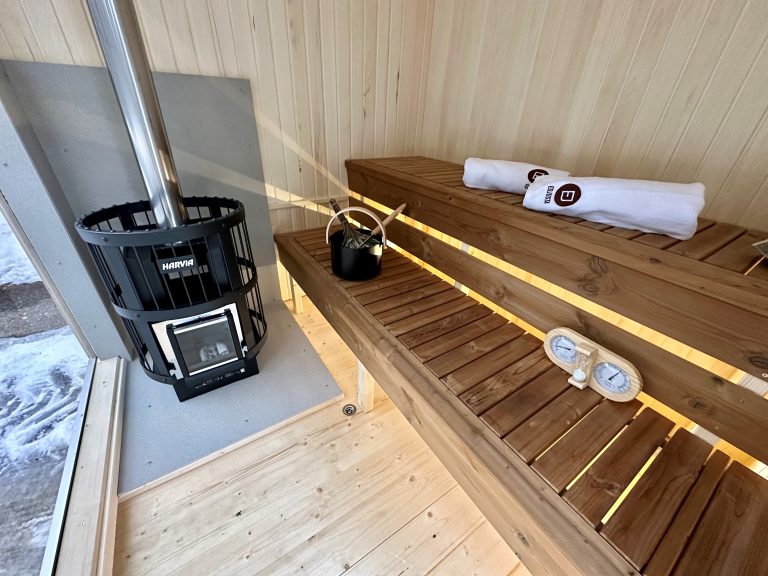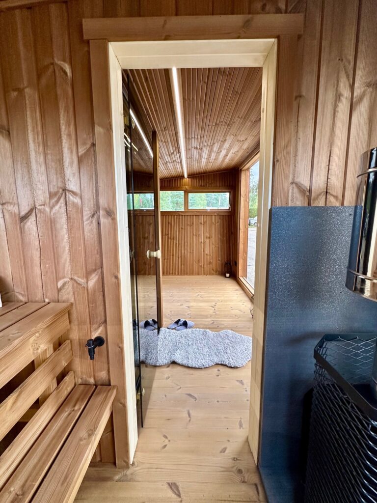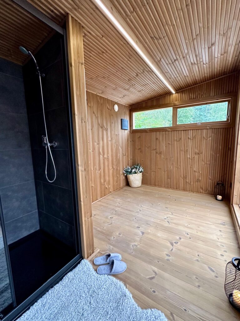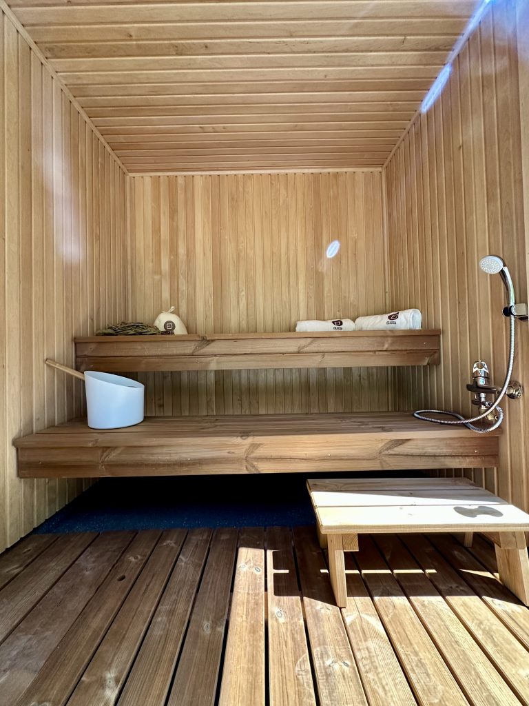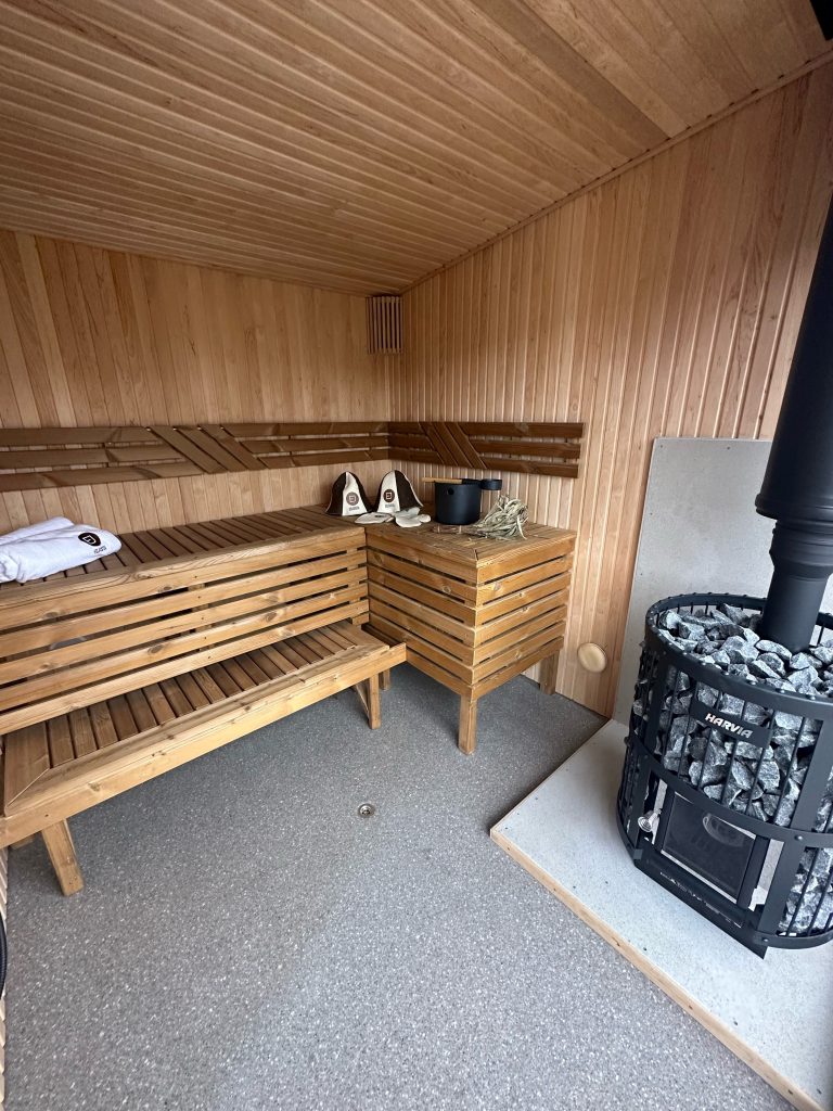 - Soft hardwood paneling for the sauna interior.