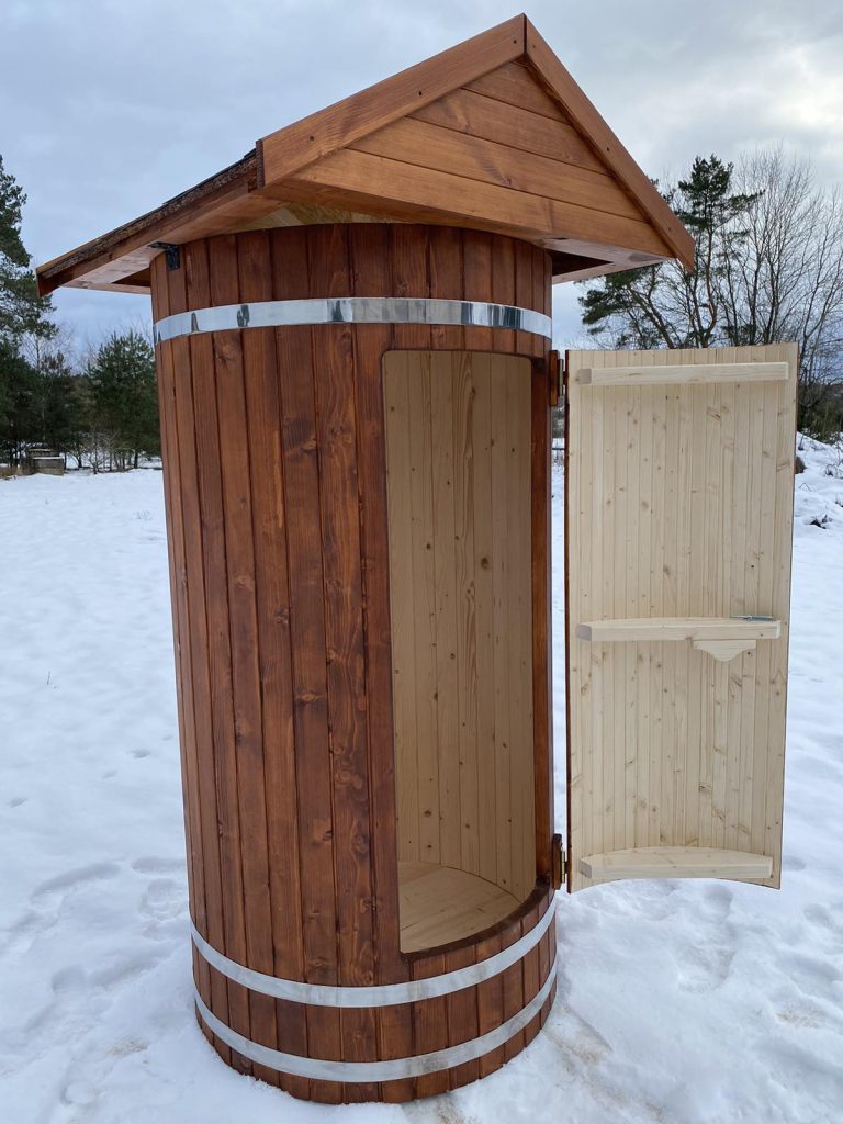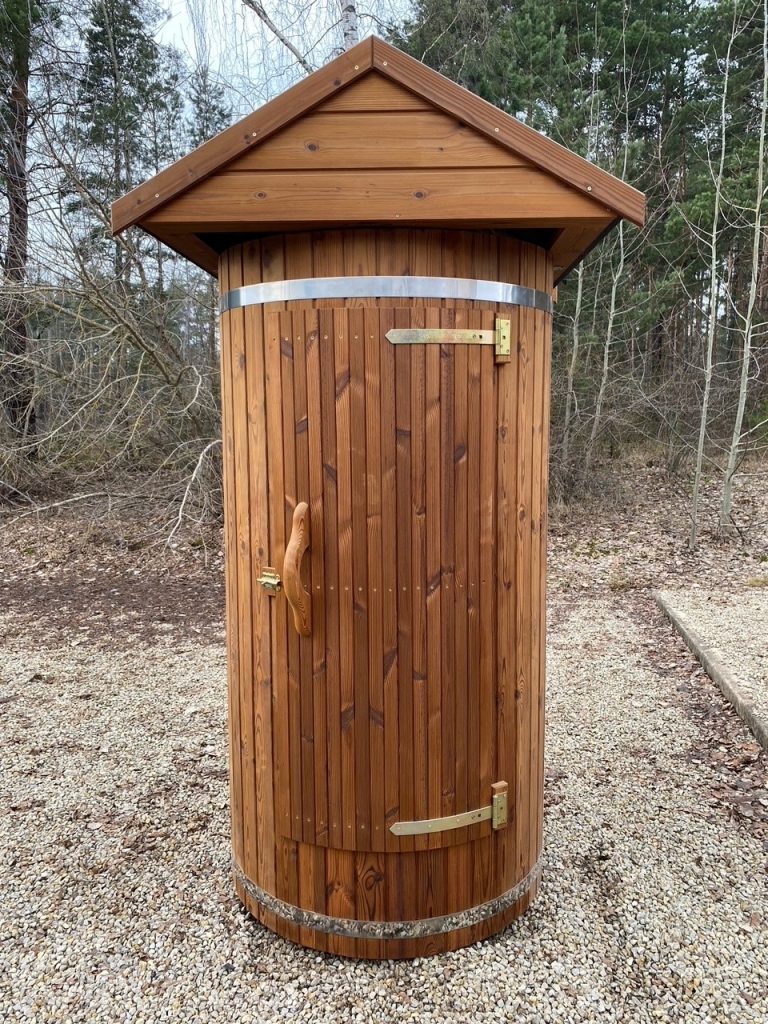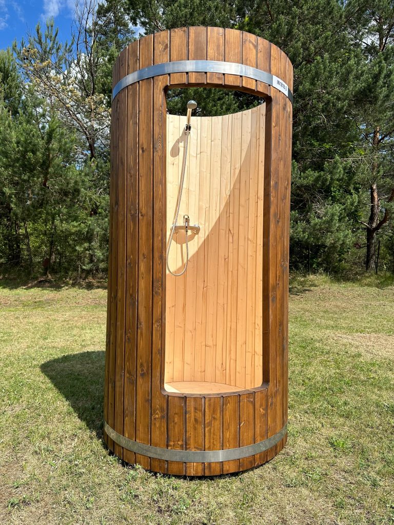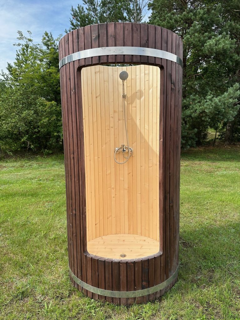 A wooden shower will greatly compliment your sauna or hot tub, or will simply look great on its own. It could be made of high-quality Scandinavian fir and thermowood. A shower is durable and does not require special care. It is protected from moisture and environmental impact. A cold shower is a convenient solution to take during hot sauna seasons. A bathing cabin does not take up too much space. Its design allows it to be set either in a courtyard or integrated with the swimming pool or outdoor wooden hot tub. This outdoor shower can be easily connected to any water heater – solar-heated water boilers or other water heating systems.