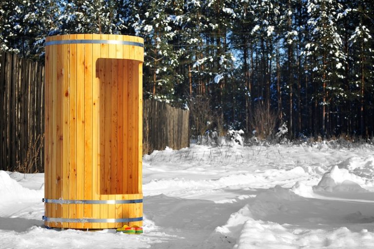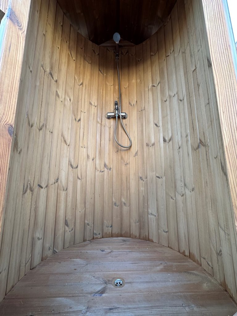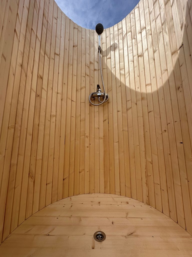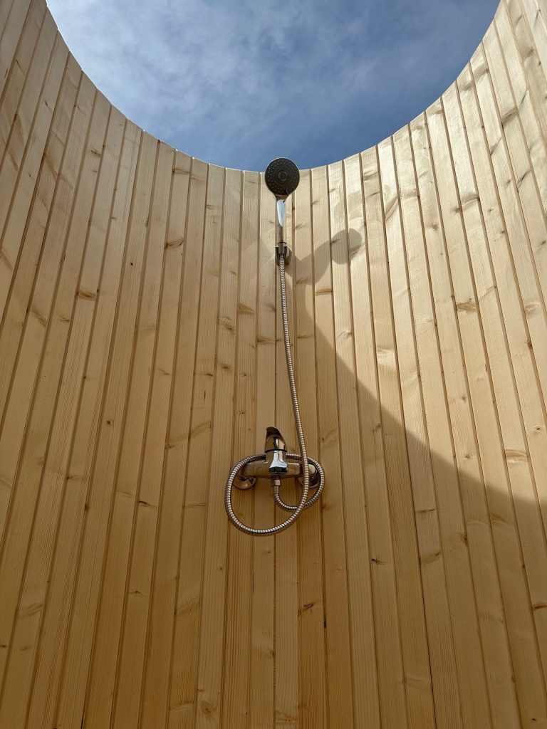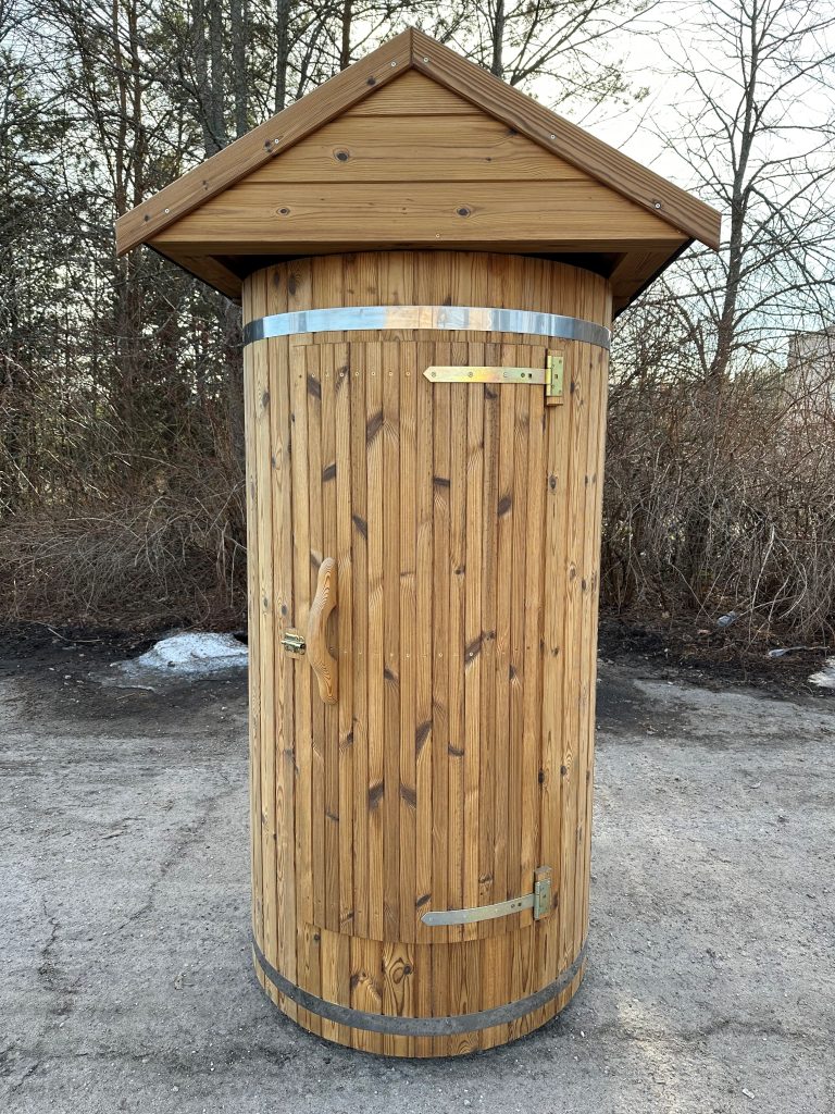 A wooden shower will greatly compliment your sauna or hot tub, or will simply look great on its own. It could be made of high-quality Scandinavian fir and thermowood. A shower is durable and does not require special care. It is protected from moisture and environmental impact. A cold shower is a convenient solution to take during hot sauna seasons. A bathing cabin does not take up too much space. Its design allows it to be set either in a courtyard or integrated with the swimming pool or outdoor wooden hot tub. This outdoor shower can be easily connected to any water heater – solar-heated water boilers or other water heating systems.